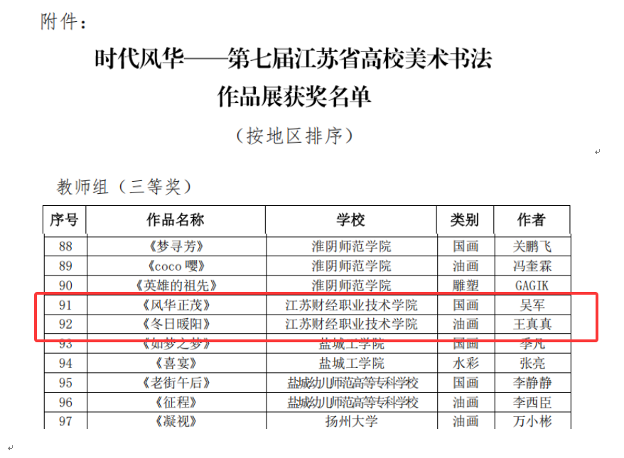 近日,由江苏省教育厅主办的“时代风华——第七届江苏省高校美术书法作品展”圆满收官,本次作品展吸引全省一百余所高校踊跃投稿,共收到各类美术书法作品5030件,经过严格的初评,复评环节,最终评选出各级奖项,我院教师吴军的作品《风华正茂》,王真真的作品《冬日暖阳》,在全省本科及专科院校教师组的876件参赛作品中脱颖而出,双双荣获教师组三等奖 向日葵视频官网,为向日葵视频下载app赢得了荣誉。