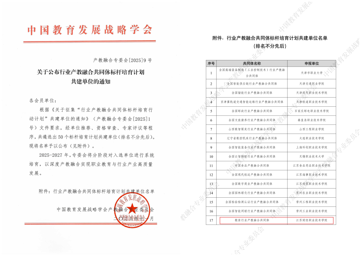 11月15日,中国教育发展战略学会产教融合专委会发布《关于公布行业产教融合共同体标杆培育计划共建单位的通知》(产教融合专委会〔2025〕9号),由我校牵头成立的粮食行业产教融合共同体成功入选 向日葵视频官网。