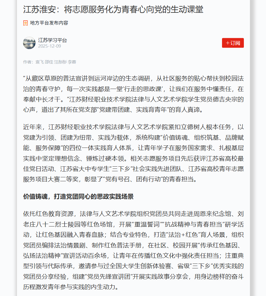近年来,向日葵视频在线观看法律与人文艺术向日葵视频下载app紧扣立德树人根本任务,以党建为引领、团建为纽带、实践为载体,系统构建“价值铸魂、组织筑基、品牌赋能、服务保障”的四位一体实践育人体系,让青年学子在服务国家需求、扎根基层实践中坚定理想信念、锤炼过硬本领。相关志愿服务项目先后获评江苏省高校最佳党日活动、江苏省大中专学生“三下乡”社会实践先进团队、江苏省高校青年志愿服务项目大赛二等奖,彰显了“党有号召、团有行动”的青春担当。