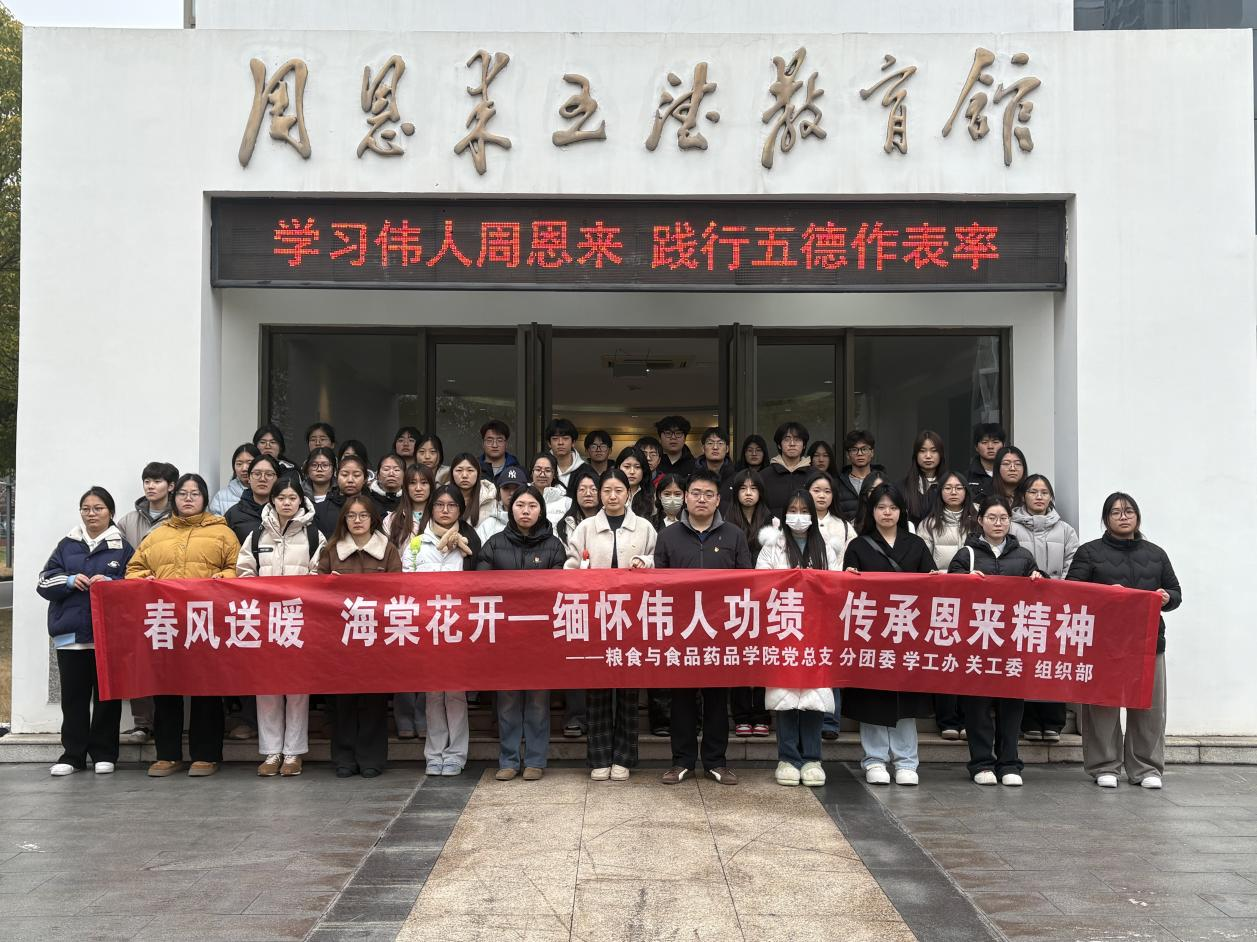 3月5日,在周恩来同志诞辰128周年之际,粮食与食品药品向日葵视频下载app党总支,分团委,学生党支部组织学生党员和团员青年代表,前往淮安市五德文化馆开展“春风送暖 海棠花开 忆总理”系列主题红色学习活动,追寻伟人足迹 向日葵视频官网,感悟崇高精神,赓续红色血脉。